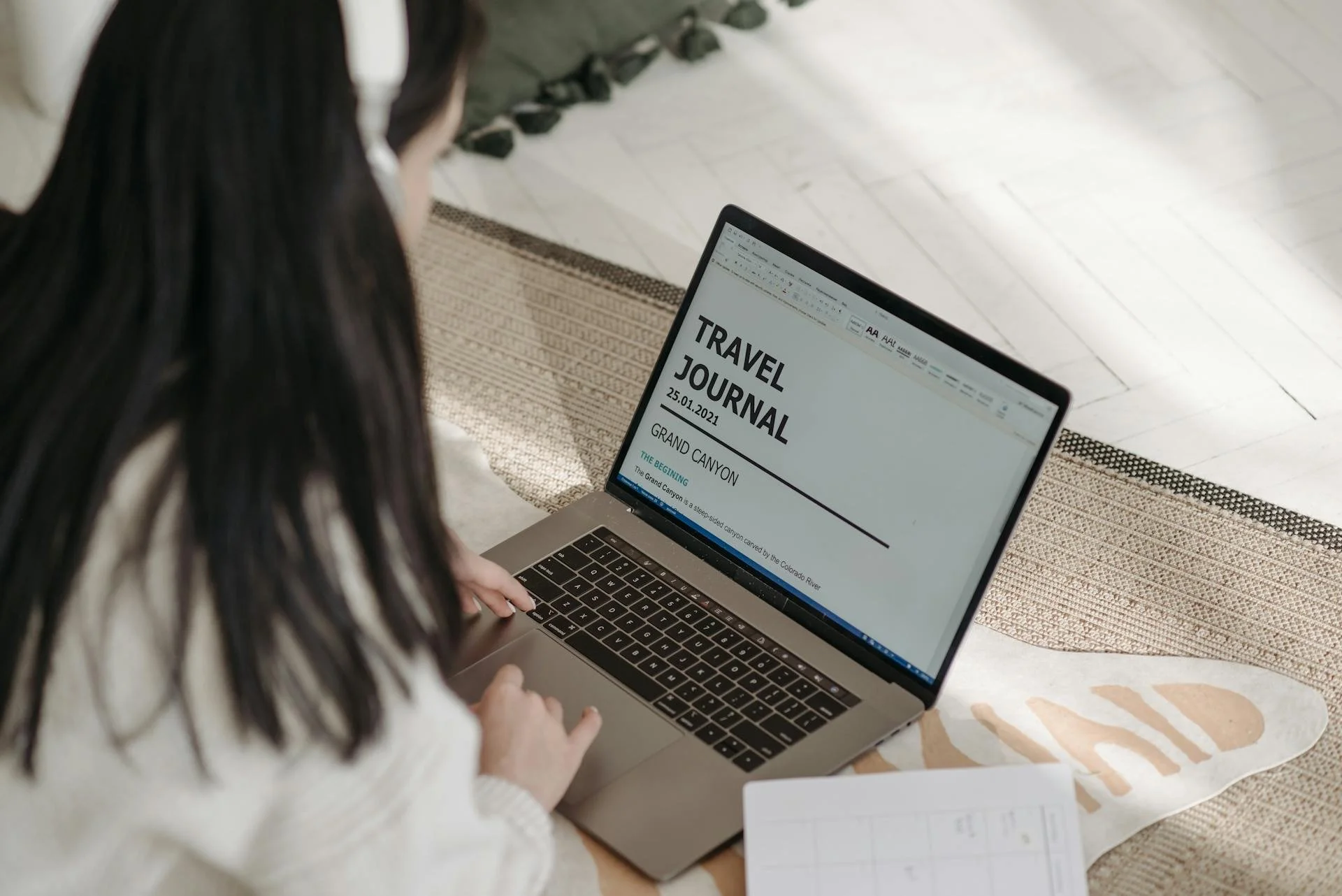 Femme utilisant un ordinateur portable affichant un journal de voyage sur le canyon du Colorado.